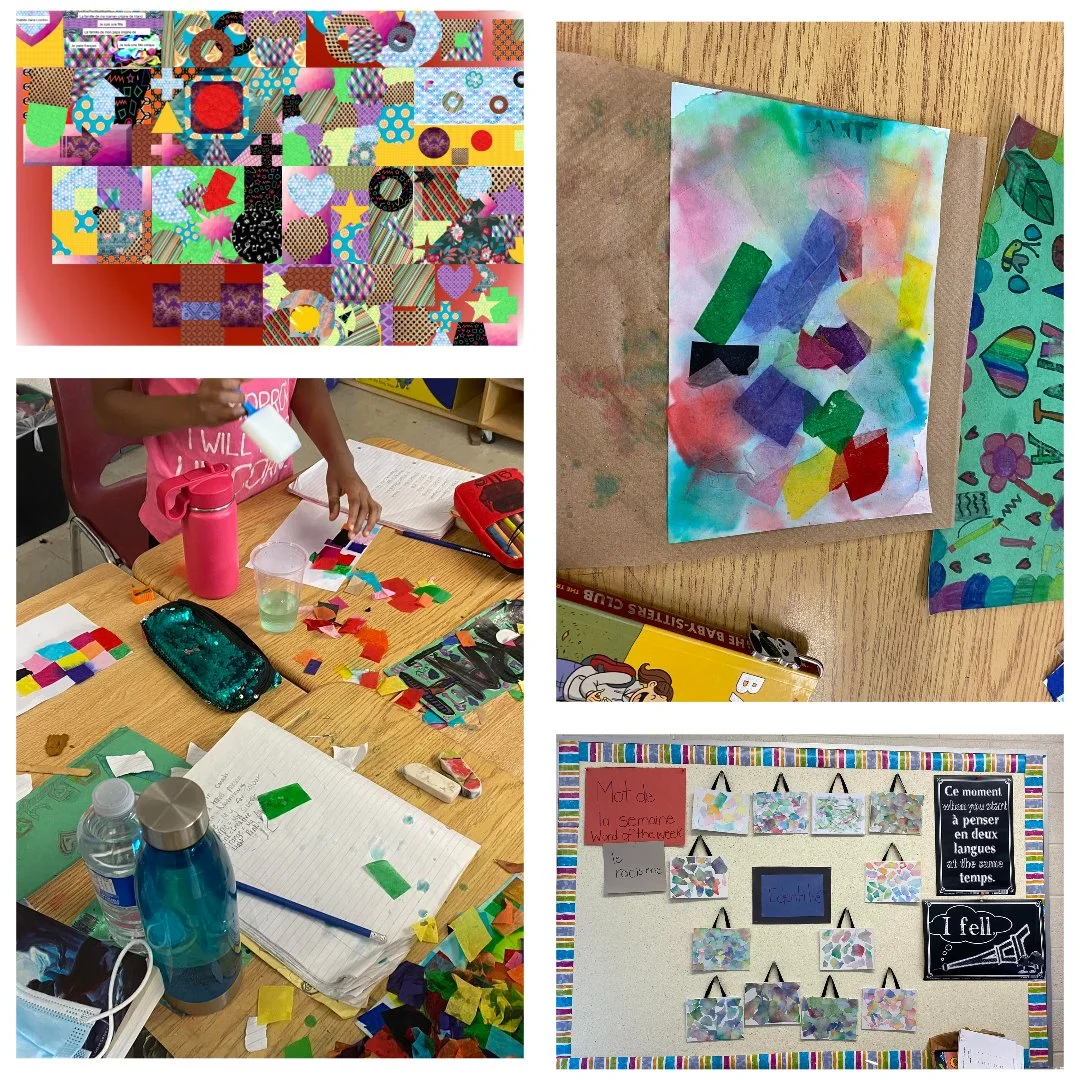 With inspiration from a workshop I attended while in teacher’s college, I led an intersectionality art project both virtually with grade 6 students and in-person with grade 3/4 students. Colored tissue paper, water, and mod podge can go a long way!